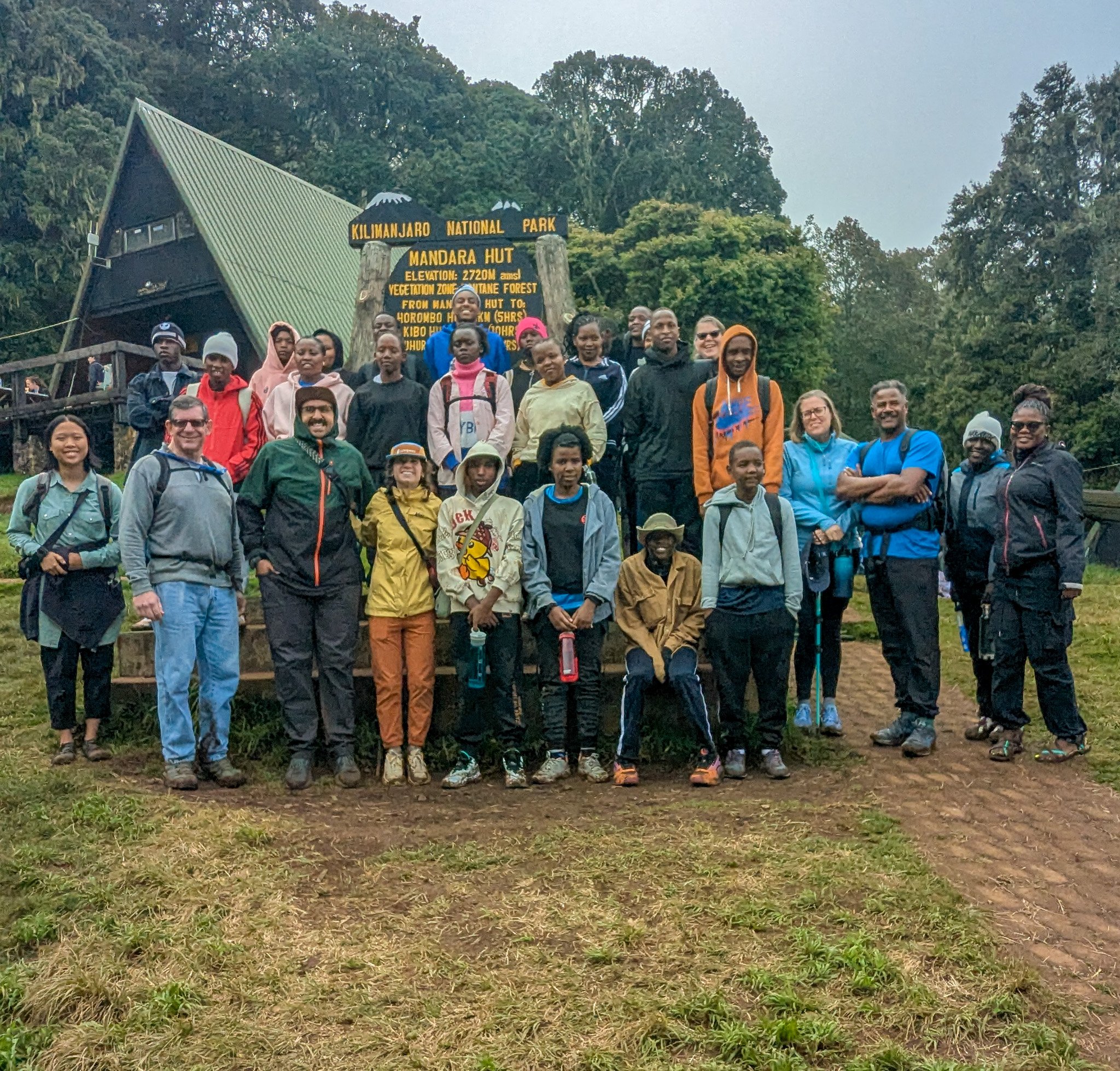 Taking the Rafiki orphans on a Mt. Kilimanjaro day trip. Pictured here at the Kilimanjaro National Park Mandara Huts, elevation approx. 8,900 feet!
