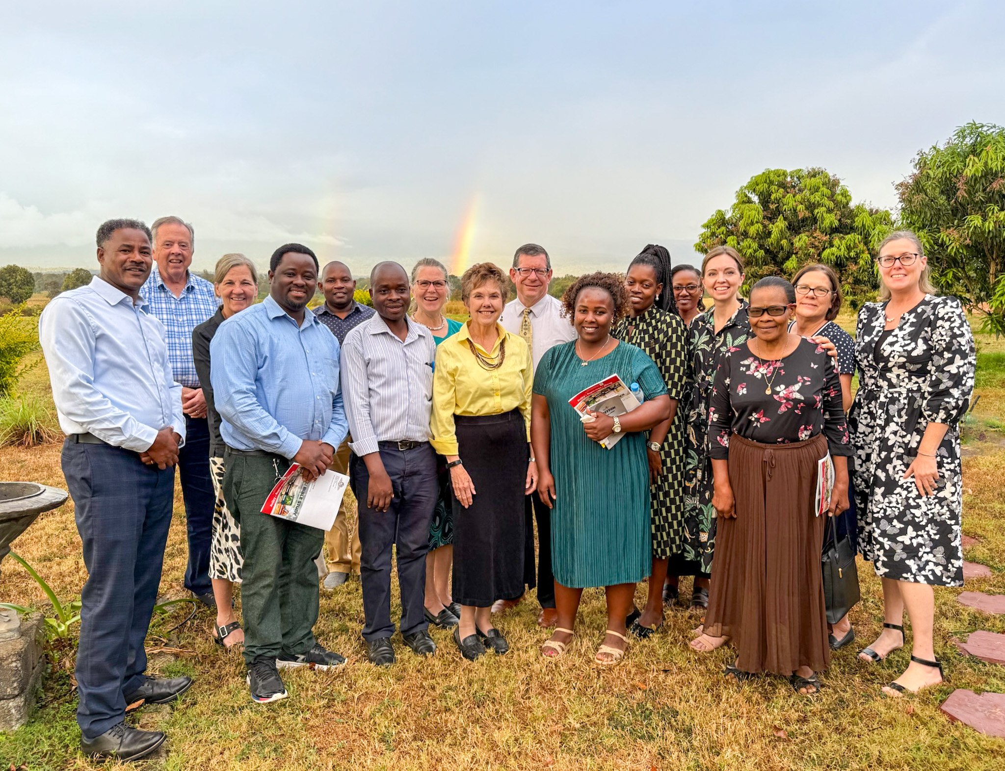 As we write this letter, we are so thankful to our Heavenly Father for how He has blessed our work. God has done great things this year in Tanzania. We have more than we can share in this brief newsletter, but we trust that what we share will be encouraging to you. Pictured below is the Home Office team that visited recently and the National Staff. If you look closely, you can see the beautiful double rainbow in the backgound.