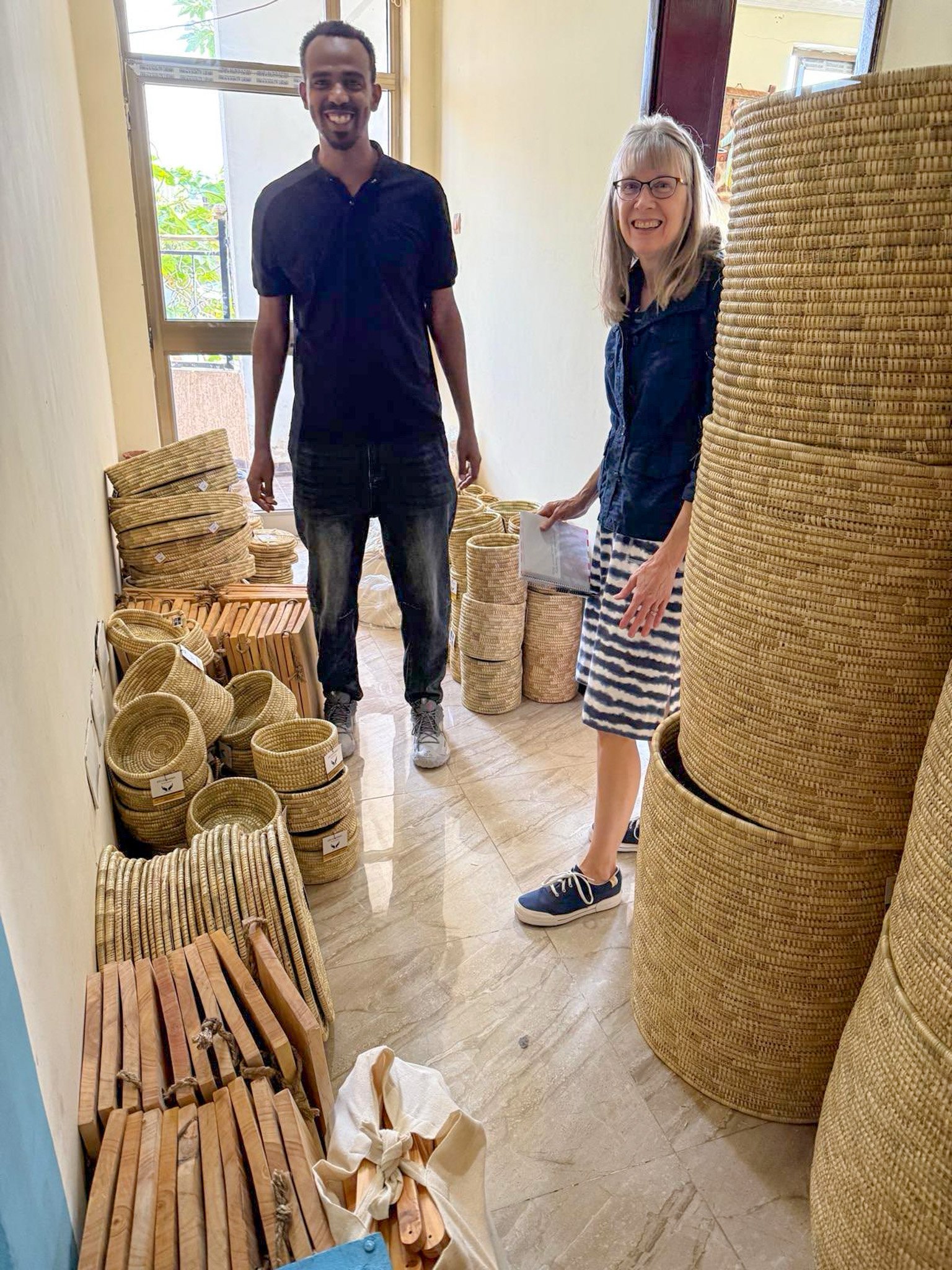 Jan and Zelalem (National Worker) inventorying Widow Program crafts